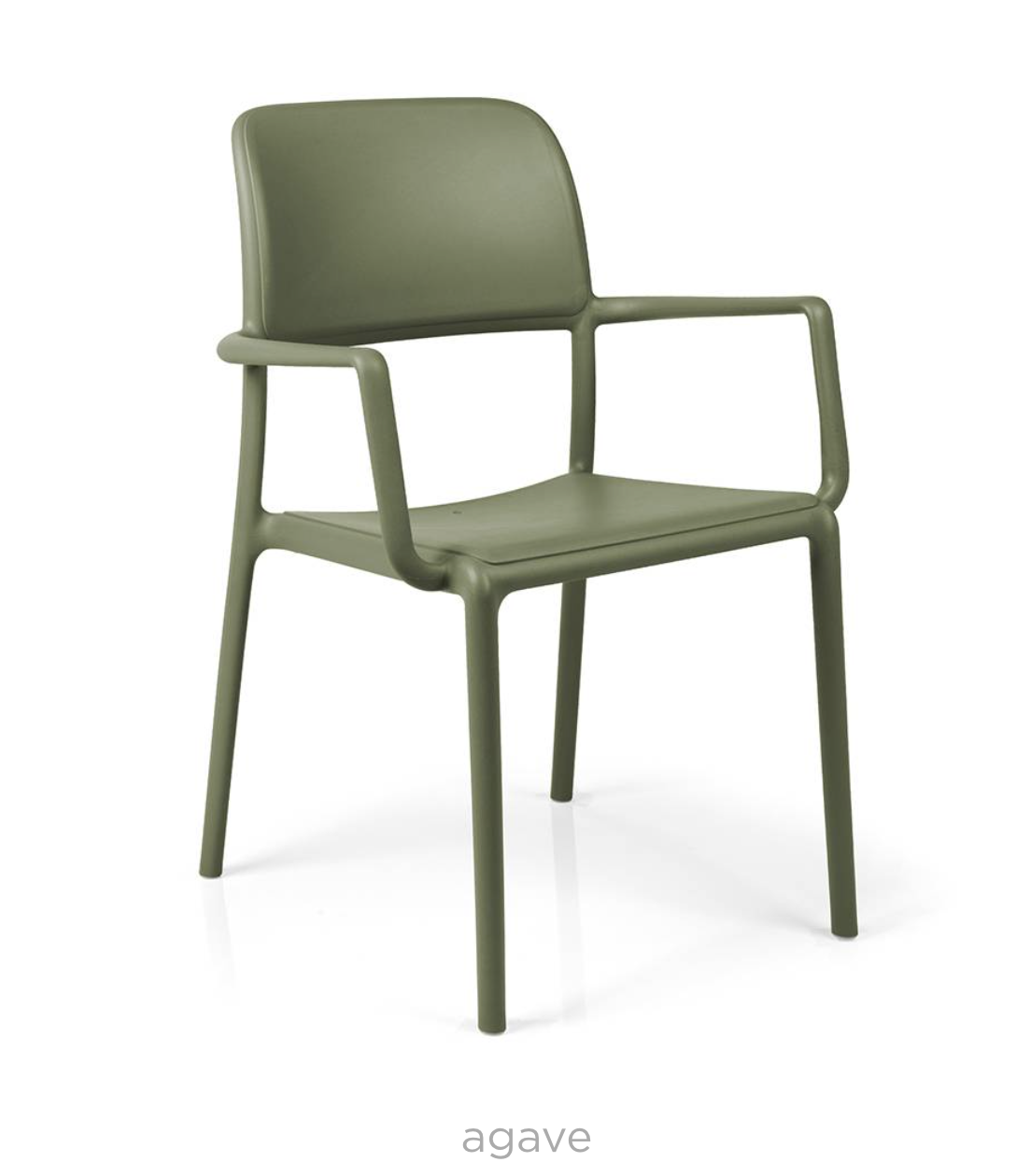 Monoblockstol med armstöd. UV-behandlad, massfärgad glasfiber av polypropen. Matt yta. Utrustad med halkfria fötter. Återvinningsbar harts.
