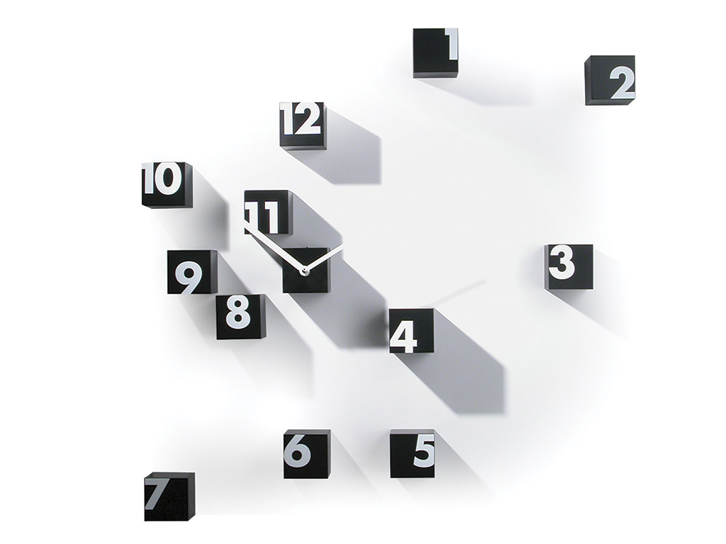 Väggklocka, polyamidkuber. Batteridrivet kvartsurverk. Denna klocka möjliggör ett personligt väggmonteringsalternativ, eftersom kuberna måste fästas fritt på väggen. Kuberna finns i svart och vitt.