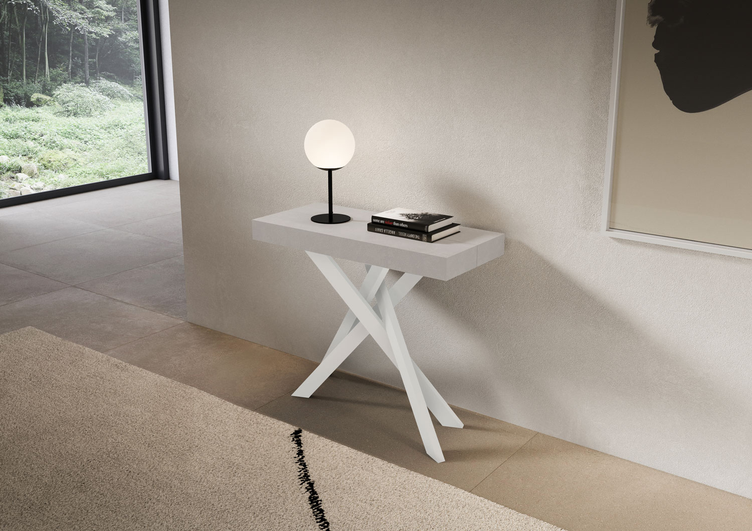 Saki Premium utdragbart konsolbord, mångsidigt och robust, ett perfekt komplement till alla rum i huset: entré, kök, matsal, vardagsrum eller hall. Det utdragbara konsolbordet Saki Premium kan enkelt omvandlas till ett stort matbord upp till 300 cm långt, med plats för 14 personer. Tillverkat med melaminpaneler och järnben, bordsskiva och förlängningar med vikfunktion. Förlängningssystemet med teleskopiska aluminiumskenor och de medföljande sidostöden gör konsolbordet stabilt och robust. När konsolbordet är stängt måste förlängningarna förvaras någon annanstans. Produkt Itamoby Tillverkad i Italien Mått: Stängt konsolbord: B. 90 D. 40 H. 77 cm Längd med 1 förlängning: 92 cm Längd med 2 förlängningar: 144 cm Längd med 3 förlängningar: 196 cm Längd med 4 förlängningar: 248 cm Längd med 5 förlängningar: 300 cm