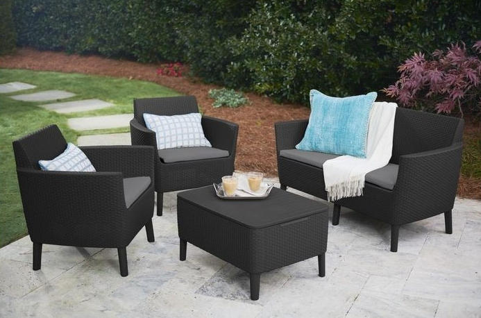 Carolina-setet från Keter består av en soffa, två fåtöljer och ett uppfällbart soffbord med träliknande hartsfinish.