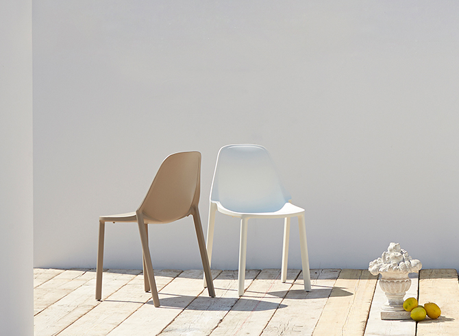 Återvinningsbar teknopolymerram. Glasfiberförstärkt. Luftgjuten teknik. För inomhus- och utomhusbruk. Stapelbar. Sedia Più är designad för storskalig användning i kontraktsmöbler, tack vare den nya 24-delade pallen som är enkel att manövrera med gaffeltruck och förvara.