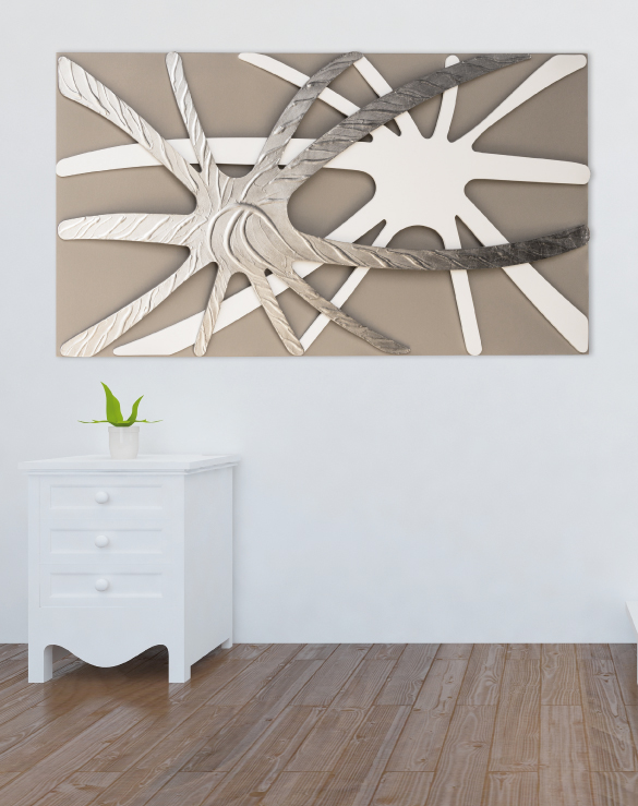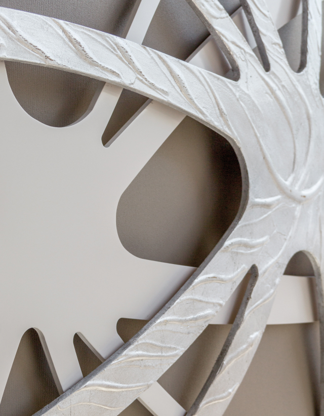Duvgrå lackerad dukmålning (handgjord vara med färg som kan variera och vara mer beige eller grå) med överlappande böjda strukturer och präglat materialhantverk, handdekorerad i bladsilver och halvblank elfenbensvit lack.