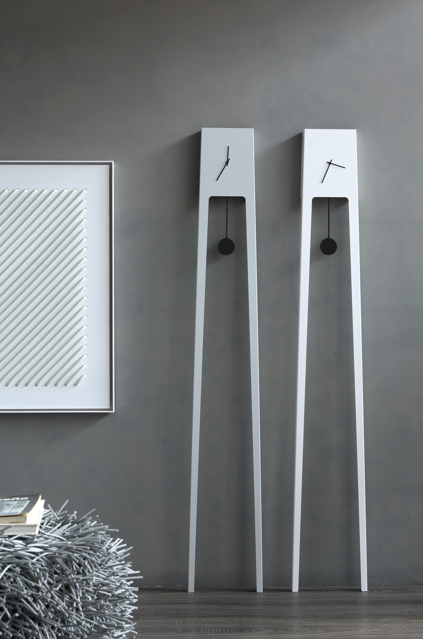 Tiuku är tillverkad av pulverlackerat stål och finns i en mängd olika färger och kan väggmonteras tack vare sin fristående struktur. Kvartsurverket garanterar precision, medan dess avlånga form och grafiska siluett gör den perfekt för att ge höga väggar, entréer, vardagsrum och kontor en modern touch.