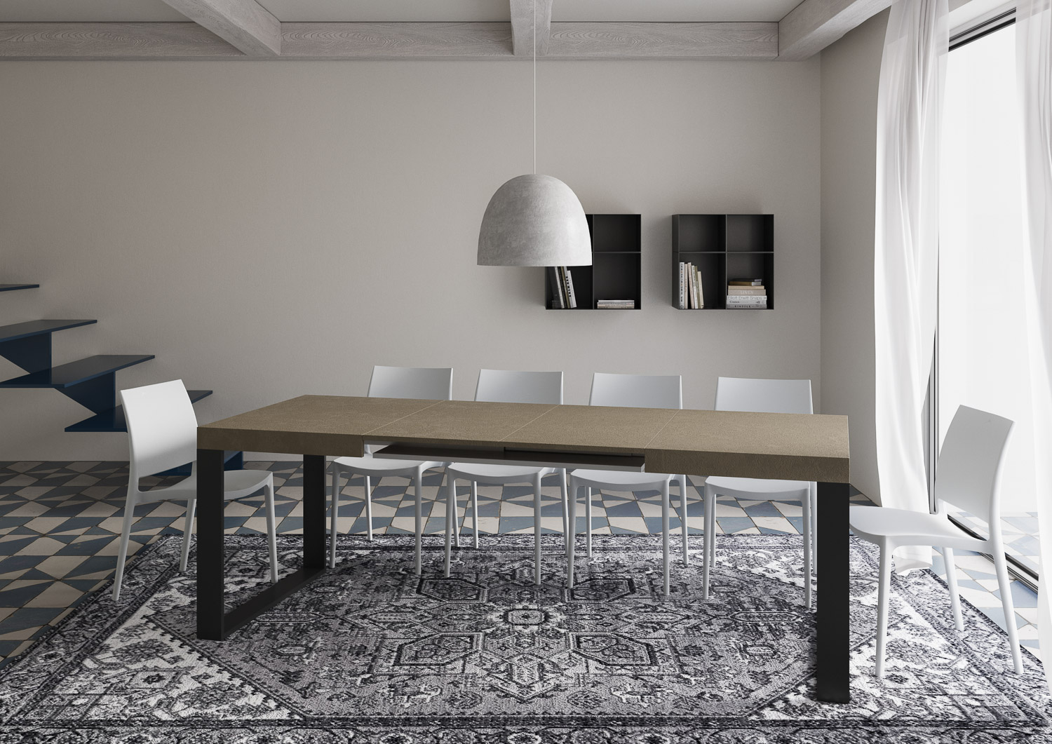 Det 140 cm höga utdragbara Tecno-bordet, med sin enkla, linjära design, anpassar sig till alla inredningsstilar och är det perfekta valet både som matbord och som inredning i ett vardagsrum, där du kan välkomna gäster med stil. Det utdragbara Tecno-bordet kan gradvis förlängas upp till 244 cm och har plats för 12 personer. Tillverkat med melaminpaneler, järnben och en fällbar bordsskiva. Förlängningssystemet med teleskopskenor i aluminium gör bordet stabilt och robust även när det är helt utfällt, utan behov av ytterligare stöd. Förlängningarna är omedelbart redo att användas eftersom de är placerade under huvudbordsskivan. Itamoby-produkt Tillverkad i Italien Mått: Stängt bord: B 140 D 90 H 77 cm Längd med 1 förlängning: 192 cm Längd med 2 förlängningar: 244 cm