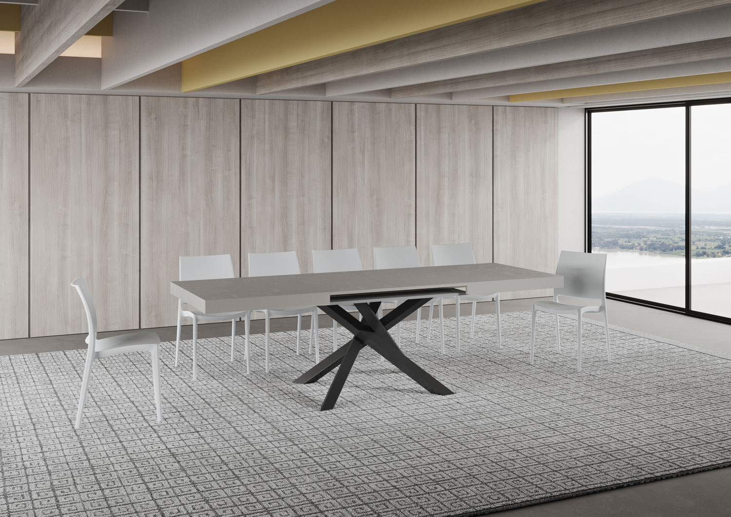 Det utdragbara Volantis-bordet på 160 cm, med sin sofistikerade moderna design, anpassar sig till alla inredningar och är det perfekta valet både som matbord och som en inredningsmöbel i vardagsrummet, där du kan välkomna gäster med stil. Det utdragbara Volantis-bordet kan gradvis förlängas upp till 264 cm och har plats för 12 personer. Tillverkat med melaminpaneler, järnben och en fällbar bordsskiva. Förlängningssystemet med teleskopskenor i aluminium gör bordet stabilt och robust även när det är helt utfällt, utan behov av ytterligare stöd. Förlängningsskivorna är omedelbart redo att användas eftersom de är placerade under huvudbordsskivan. Itamoby-produkt Tillverkad i Italien Mått: Stängt bord: B 160 D 90 H 77 cm Längd med 1 förlängning: 212 cm Längd med 2 förlängningar: 264 cm