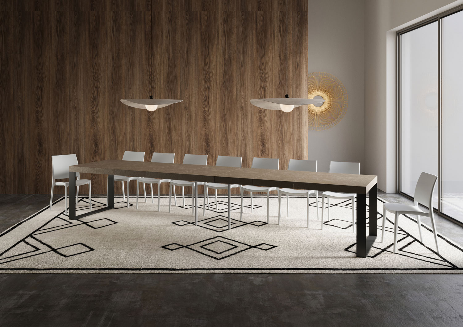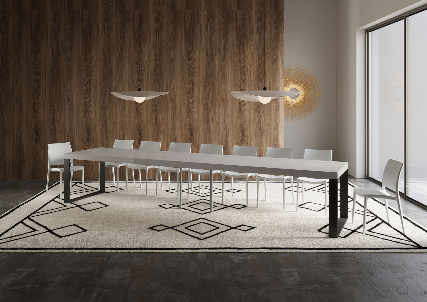 Det utdragbara Tecno Premium-bordet på 160 cm, med sin enkla, rena design, anpassar sig till alla inredningsstilar och är det perfekta valet både som matbord och som en inredningsmöbel i vardagsrummet, där du kan välkomna gäster med stil. Det utdragbara Tecno Premium-bordet kan gradvis förlängas upp till 420 cm och rymmer upp till 18 personer. Bordet är tillverkat av melaminpaneler, järnben och en fällbar skiva och iläggsskivor, vilket gör det stabilt och robust även när det är helt utdraget. Förlängningssystemet, med teleskopskenor i aluminium och ett centralt stöd, gör bordet stabilt och robust även när det är helt utdraget. När de inte används passar iläggsskivorna inte inuti bordsramen och måste förvaras. Itamoby-produkt Tillverkad i Italien Mått: Stängt bord: L.160 D.90 H.77 cm Längd med 1 förlängning: 212 cm Längd med 2 förlängningar: 264 cm Längd med 3 förlängningar: 316 cm Längd med 4 förlängningar: 368 cm Längd med 5 förlängningar: 420 cm