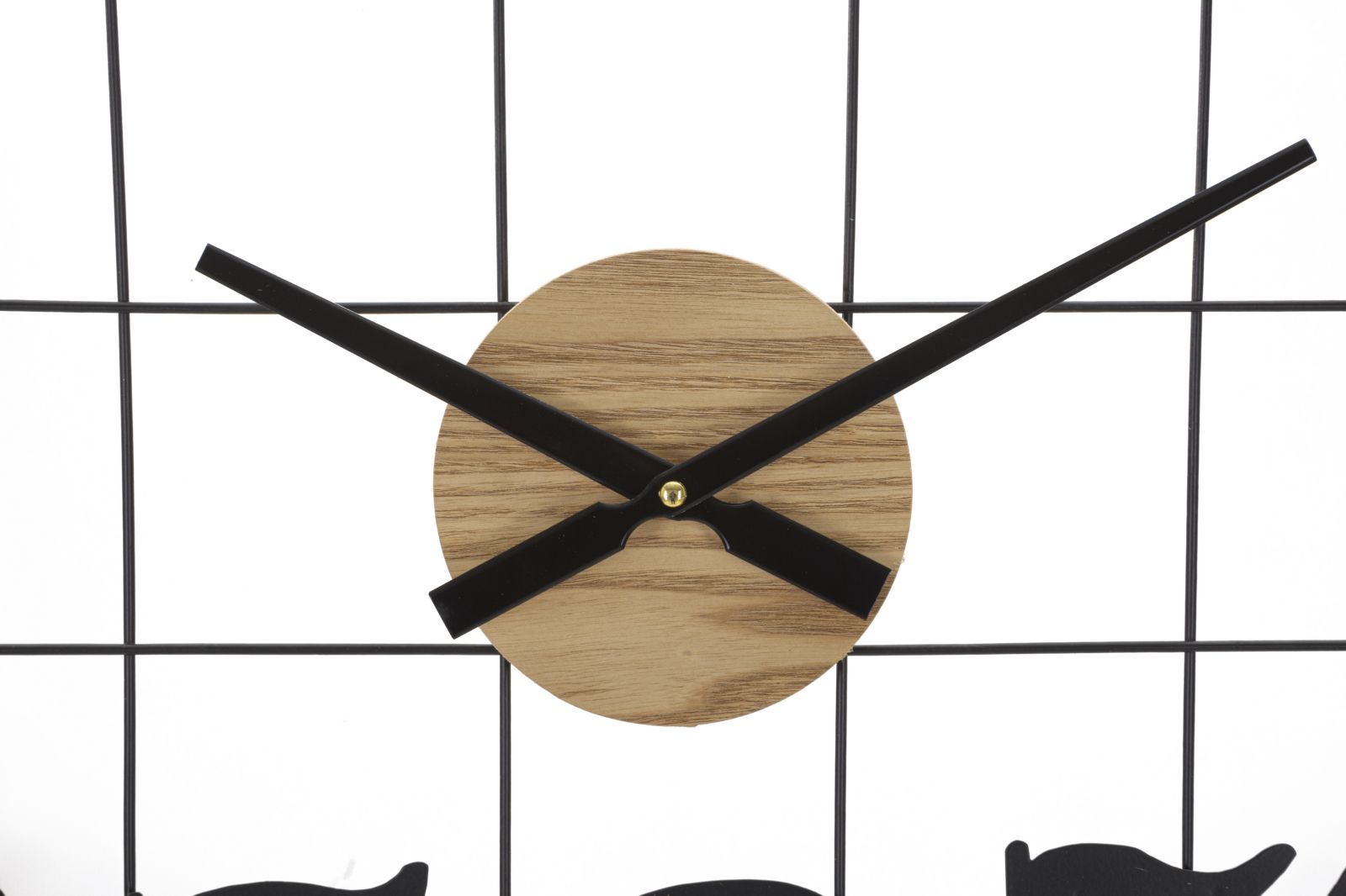 Rund väggklocka i metall och trä med vanliga fyrkanter. Drivs med AA-batterier (ingår ej).