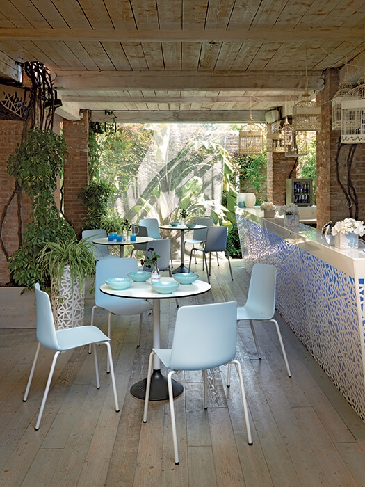 De är stapelbara och passar både inomhus, i den förkromade versionen, och utomhus, i den målade versionen. Konceptet är att erbjuda en produktkollektion som avsiktligt är begränsad till ett fåtal modeller, inriktad på restaurangsektorn men även därutöver, tack vare den mångsidighet som den grundläggande designen och utbudet av skal-/ramfärgkombinationer erbjuder.