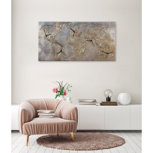 Handdekorerad kanvasstruktur med fem urtavlor, präglat materialarbete och silverblad.