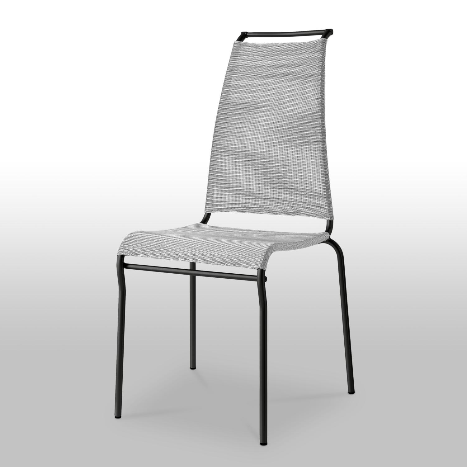 Caratterizzata da un comodo schienale alto, la sedia impilabile presenta una struttura in metallo, disponibile nelle finiture cromato o verniciato satinato.
