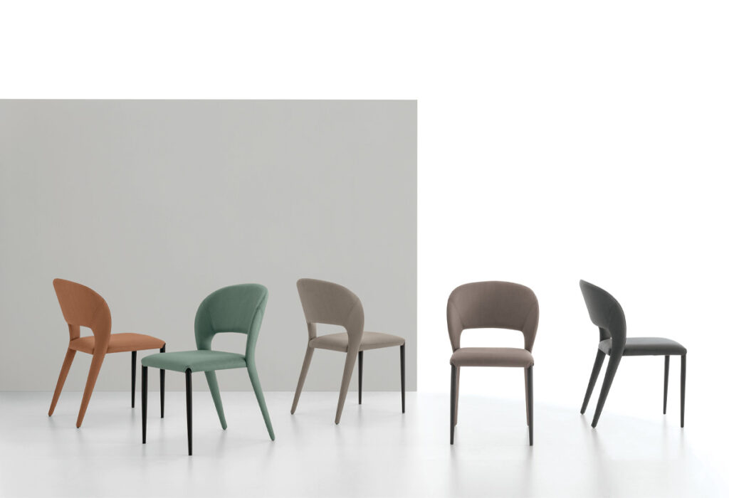 Sedia con gambe svasateL’incontro di stili e forme diversi, in una sedia che si eleva a protagonista dell’ambiente. Le gambe posteriori svasate sono in contrasto con quelle anteriori, dritte, per creare un insieme unico nel suo genere, in termini di stile e comodità!