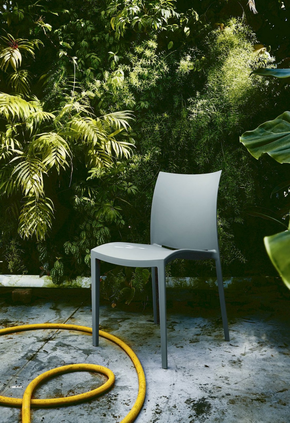 Sedia impilabile in polipropilene soft touch, riciclabile ed adatta ad uso esterno.
