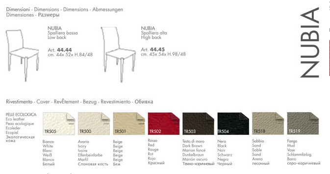 Sedia con struttura in acciaio completamente rivestita in: PELLE ECOLOGICA nei colori: BIANCO TR505, AVORIO TR500, BEIGE TR501, SABBIA TR518, FANGO TR519, MARRONE TR510, TESTA DI MORO TR503, ROSSO TR502, BORDEAUX TR509, ROSA TR511, LILLA TR512, VERDE TR513, BLU TR514, BLU COBALTO TR515, GRIGIO CHIARO TR516, ANTRACITE TR517, NERO TR504. Dimensioni spalliera alta: 44x54xh98/48 cm Specificare colore rivestimento tramite mail a info@tecnoarredo3.com