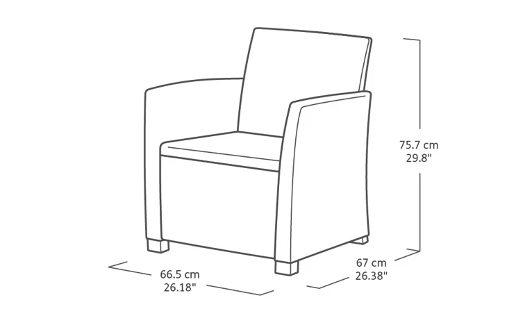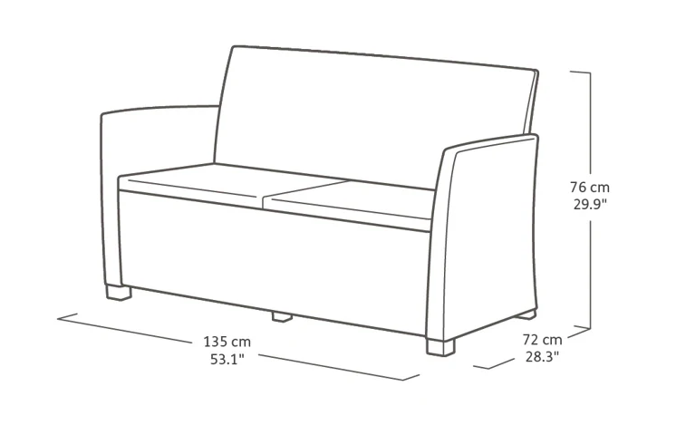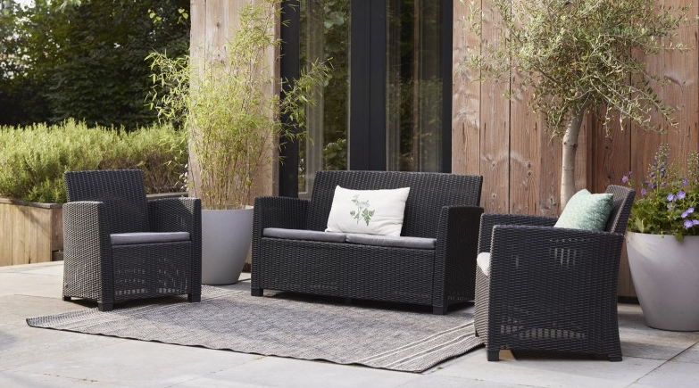 Il set Mia di Keter è un lounge set da esterno composto da divano, due poltrone e un tavolino contenitore.
