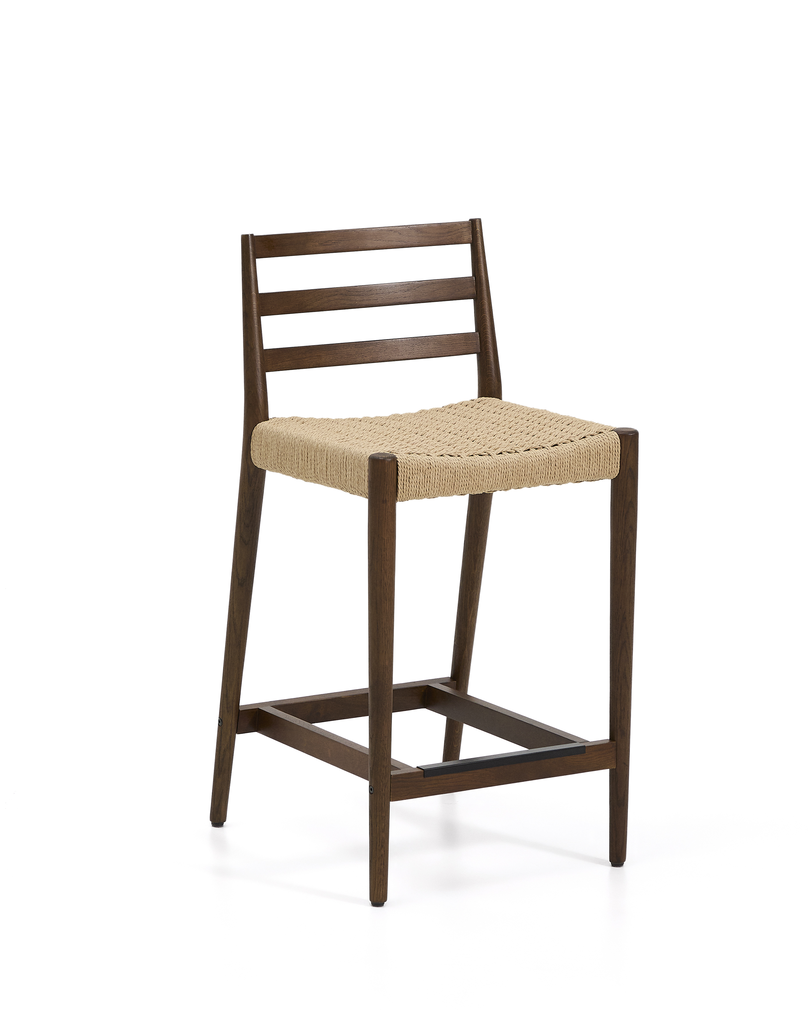 Sgabello Analy con schienale in legno massello di rovere con finitura noce e seduta in corda, 65 cm, FSC 100%