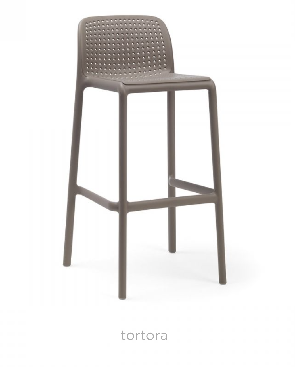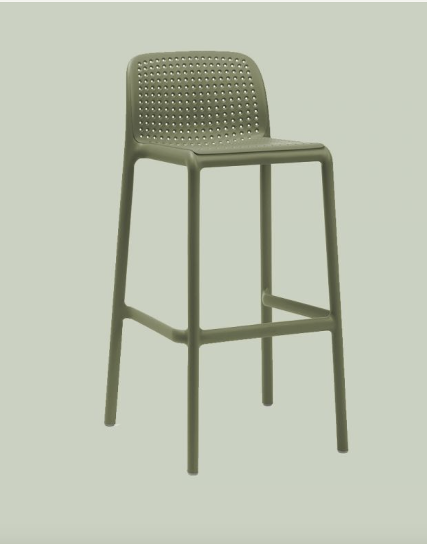 Sgabello monoblocco. Polipropilene fiberglass trattato anti-UV e colorato in massa. Finitura opaca. Dotato di piedini antiscivolo. Altezza seduta 76 cm. Resina riciclabile.