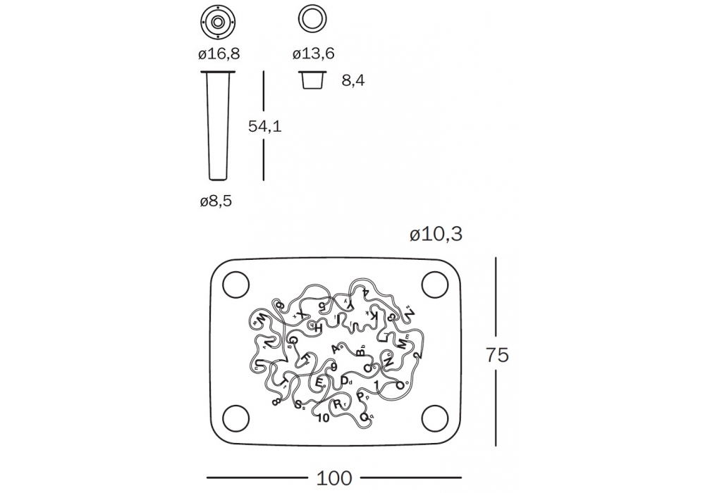 Piano inMDF rivestito di foglia polimerica bianco forato per l'alloggiamento delle vaschette portapenne arancioni e 4 gambe in policarbonato trasparente neutro. Spessore 60 cm.