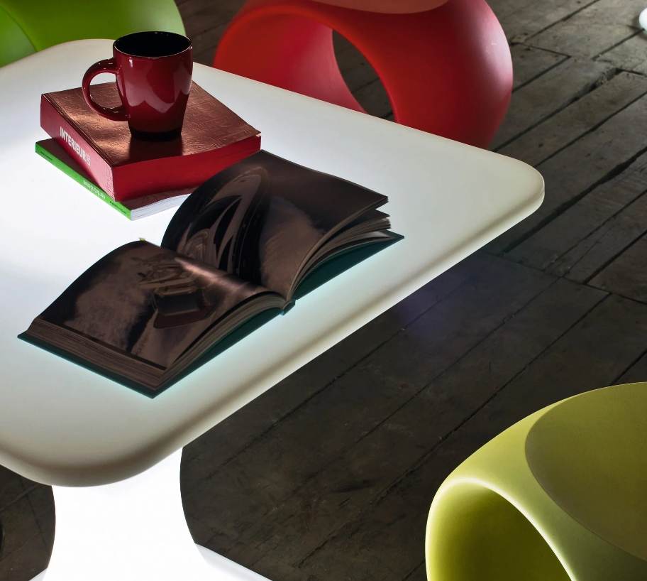La sua forma concava accogliente invita all'utilizzo, promuovendo la convivialità e la condivisione. Si tratta di un tavolo da giardino informale pensato per l'arredo outdoor/indoor, ideale per contesti contract ma altrettanto adatto all'utilizzo domestico, sia come arredo per la casa che per il giardino. Le sue linee sinuose e delicate si integrano perfettamente sia con il paesaggio naturale che negli spazi interni, trovando la loro collocazione ideale in ambienti collettivi, showroom, negozi, luoghi di attesa e relazione, così come negli spazi residenziali.