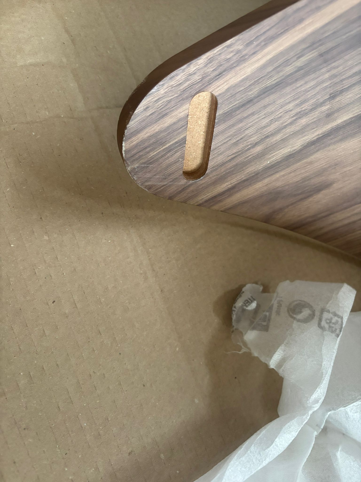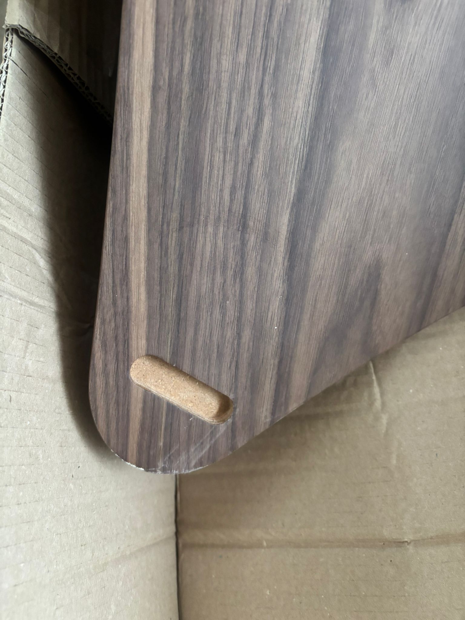 Tavolino in mdf curvato laccato o rivestito legno con top in vetro curvato.
