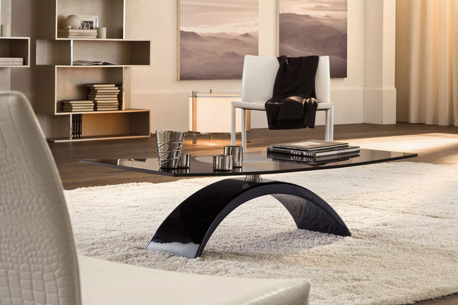 Tavolino con base in agglomerato, piano in vetro curvato.