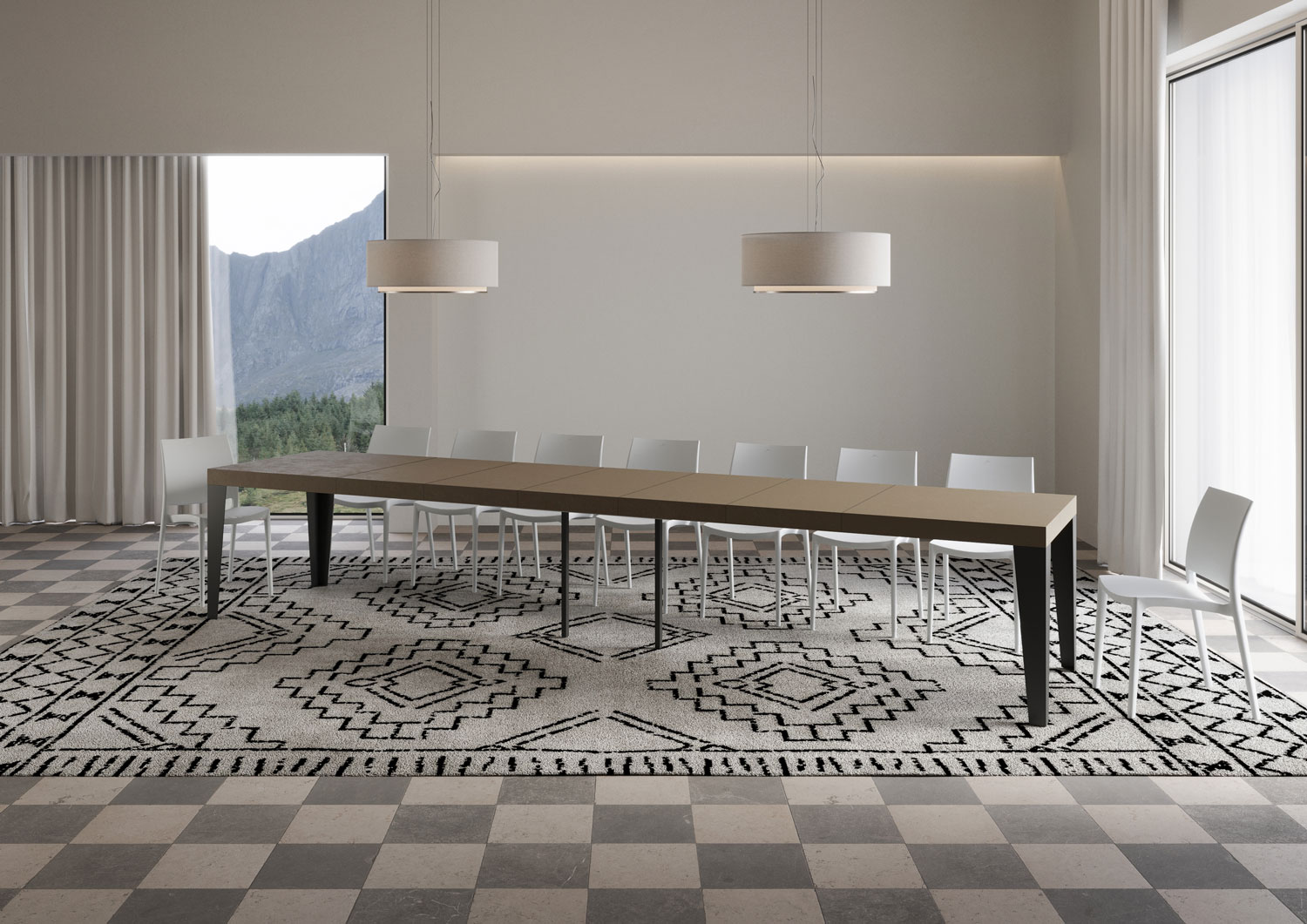 Tavolo allungabile Flame Premium da 160 cm, dal design lineare, semplice ed essenziale, si adatta a qualsiasi stile di arredamento e si rivela la scelta ideale sia come tavolo da pranzo che come elemento d'arredo per il soggiorno, dove poter accogliere i propri ospiti con stile. Il tavolo allungabile Flame Premium è in grado di estendersi progressivamente fino a 420 cm capace di ospitare 18 persone. Realizzato con pannelli in nobilitato, gambe in ferro, piano e allunghe con lavorazione a Folding. Il sistema di estensione con guide telescopiche in alluminio rende il tavolo stabile e robusto anche se totalmente allungato, senza bisogno di ulteriori sostegni. Quando non utilizzate, le allunghe non trovano collocamento all’interno della struttura del tavolo e vanno quindi riposte altrove. Prodotto Itamoby Made in Italy Dimensioni: Tavolo chiuso: L.160 P.90 H.77 cm Lunghezza con 1 allunga: 212 cm Lunghezza con 2 allunghe: 264 cm Lunghezza con 3 allunghe: 316 cm Lunghezza con 4 allunghe: 368 cm Lunghezza con 5 allunghe: 420 cm