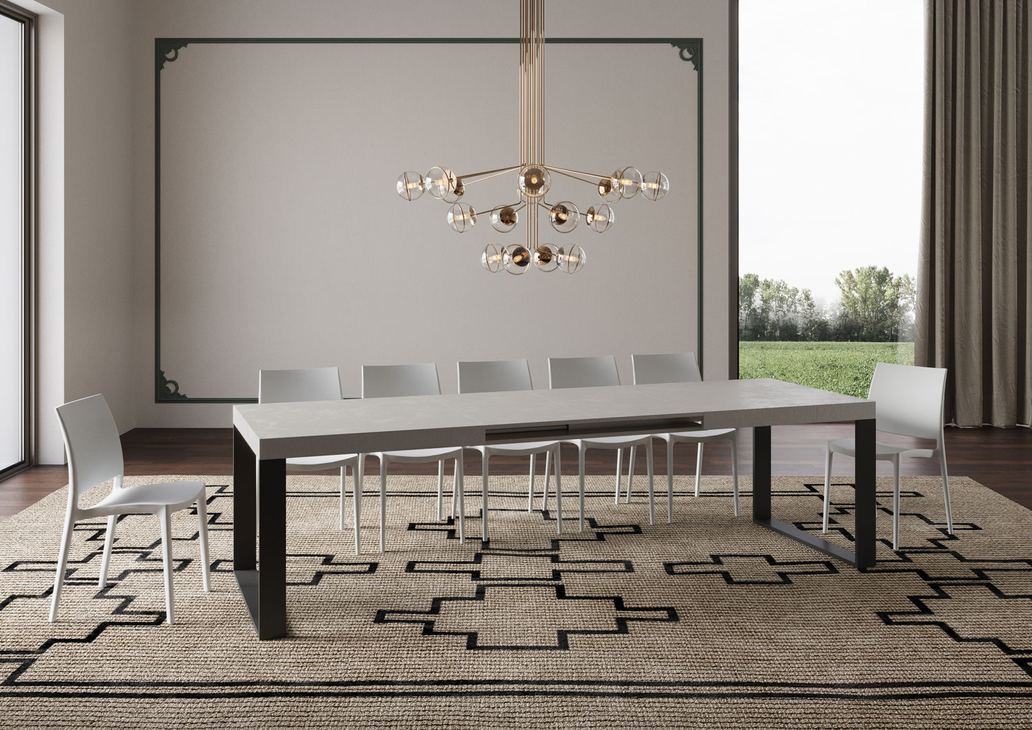 Tavolo allungabile Tecno da 180 cm, dal design lineare, semplice ed essenziale, si adatta a qualsiasi stile di arredamento e si rivela la scelta ideale sia come tavolo da pranzo che come elemento d'arredo per il soggiorno, dove poter accogliere i propri ospiti con stile. Il tavolo allungabile Tecno è in grado di estendersi progressivamente fino a 440 cm capace di ospitare 18 persone. Realizzato con pannelli in nobilitato, gambe in ferro, piano con lavorazione a Folding. Il sistema di estensione con guide telescopiche in alluminio e il sostegno centrale in dotazione rendono il tavolo stabile e robusto anche se totalmente allungato. Due allunghe sono alloggiate sotto il piano pronte all'utilizzo mentre le rimanenti tre vanno riposte altrove. Prodotto Itamoby Made in Italy Dimensioni: Tavolo chiuso: L.180 P.90 H.77 cm Lunghezza con 1 allunga: 232 cm Lunghezza con 2 allunghe: 284 cm Lunghezza con 3 allunghe: 336 cm Lunghezza con 4 allunghe: 388 cm Lunghezza con 5 allunghe: 440 cm