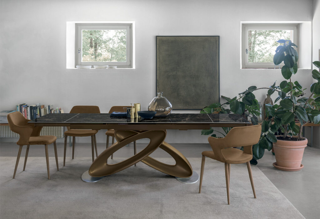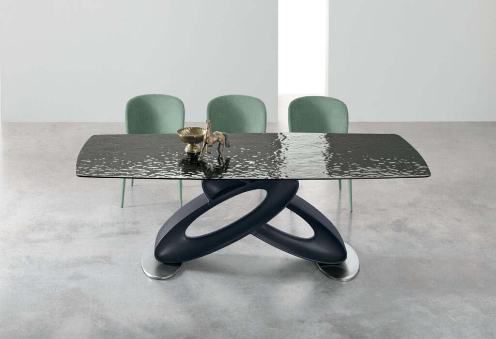 Un tavolo dal basamento centrale scultoreo, che diventa protagonista assoluto della scena, valorizzato dal piano, personalizzabile a seconda dello stile. Per un ambiente dal carattere fuori dal comune.