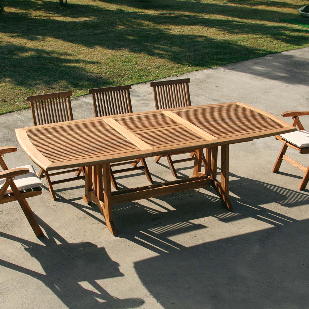 Costruito in autentico teak indonesiano, questo tavolo esprime la bellezza intrinseca e la solidità che solo il legno massello sa offrire, creando un ambiente raffinato e invitante per le vostre occasioni all'aperto.
