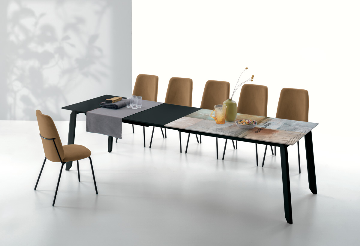 Le tre allunghe integrate permettono di espandere il piano del tavolo in modo flessibile, garantendo la massima versatilità e adattabilità a ogni situazione.