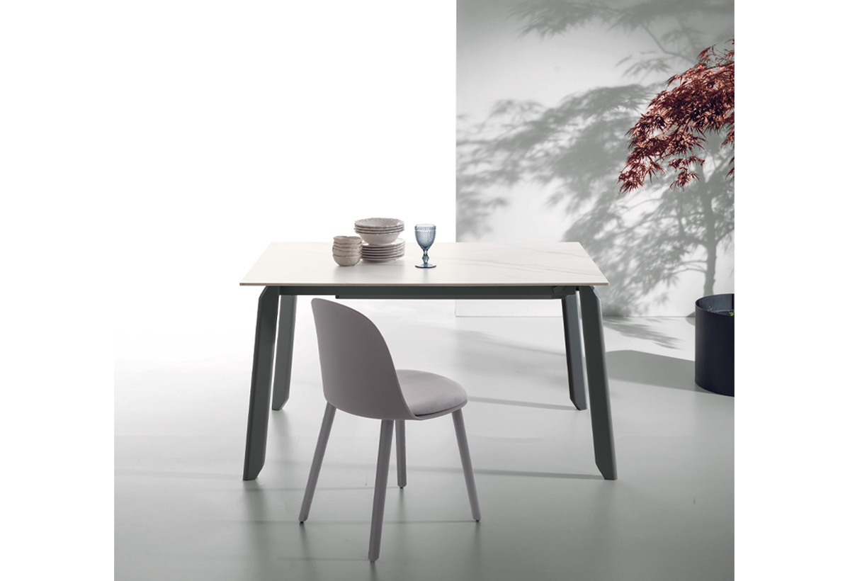 Il tavolo Efesto è caratterizzato da una robusta struttura a quattro gambe in metallo verniciato, disponibile nei colori Bianco, Nero, Grafite o Terra.